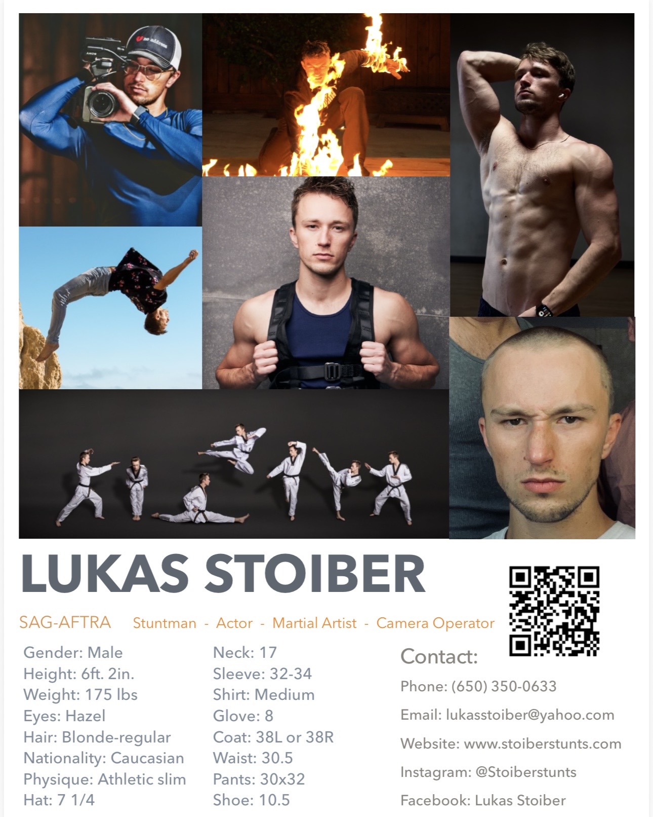 - Fighting, Fights, Flips, Fire-burns, Falls, Wrecks, Pratfalls, High falls, Stairfalls, Scorpion, Taco, Deadfall, Running Deadfall, Dive Roll, Hong Kong, Wire-Work, Explosions, Reactions, Car hits, Car exits, Precision driving, Motorcycle, Manual, Stickshift driving, Skateboard, Onewheel, Snowboard, Parkour, Freerunning, Backflip, Frontflip, Sideflip, Arial, Flashkick, Track and Field - High jump, Taekwondo, Wrestling, Grappling, Judo, Bo-staff, Sword, Nunchuck, Kamas, Skateboarding, Snowboarding, Wakeboarding, Skiing, Board Breaking, Breakaways